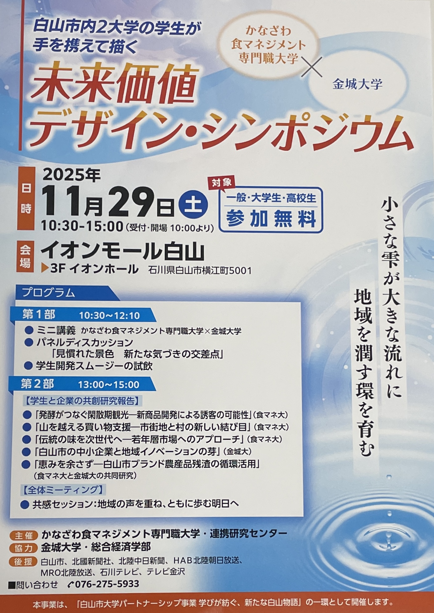 このたび、本学かなざわ食マネジメント専門職大学は、金城大学・総合経済学部と連携し、白山市を舞台にした市民参加型イベント「未来価値デザイン・シンポジウム」を、イオンモール白山にて開催しました。